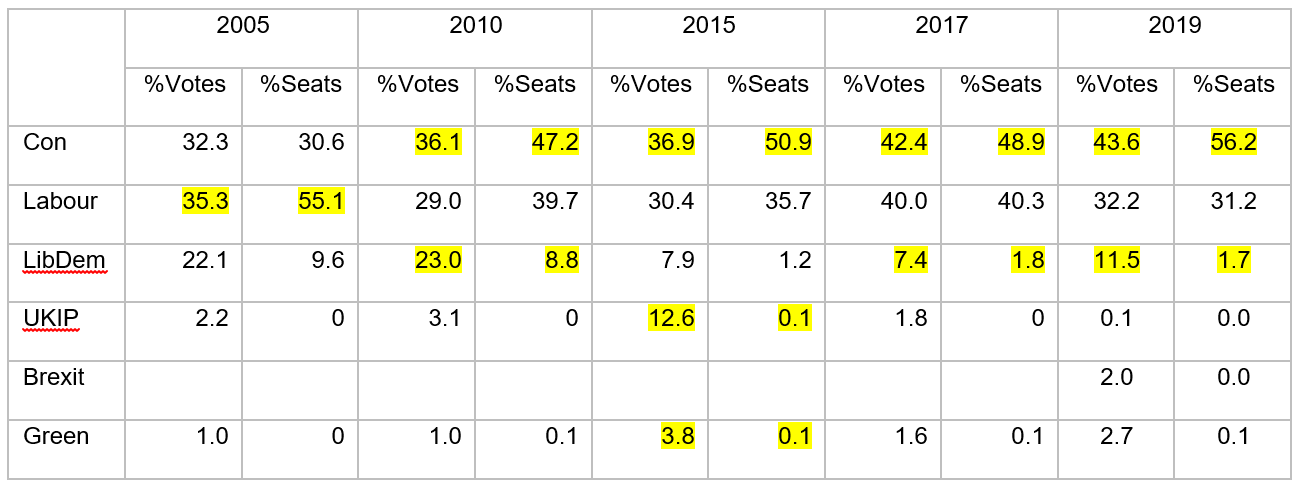 Was this General Election result a one-off? As the table of previous results below shows, with the worst disparities highlighted, the First-past-the-post voting system has been producing distorted results for years:-